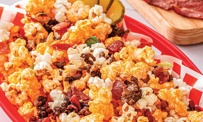 Celebrate Popcorn Poppin’ Month this October with a combination of two favorite tailgate foods in this Bacon Cheeseburger Popcorn recipe. It calls for a mixture of spices that mimic the cheeseburger experience along with hearty bacon and ground beef for a filling snack that gets you ready for kickoff.